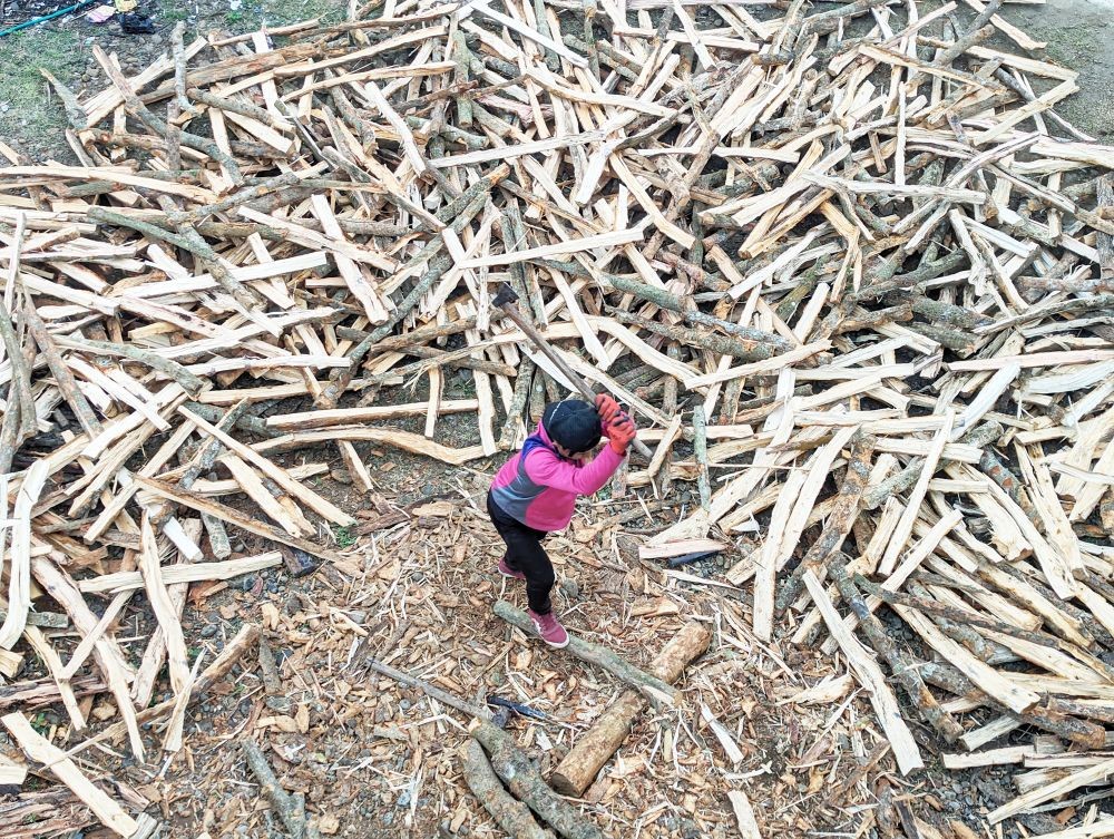A man is seen splitting logs with an axe into firewood in the outskirts of Dimapur in preparation for the next winter. The ideal time to cut firewood is in the late winter or early spring, at least six months ahead of using it in order to allow maximum drying time. The freshly cut wood will be dried in the sun before the onset of the rainy season and will then be stacked in a shed. (Morung Photo)