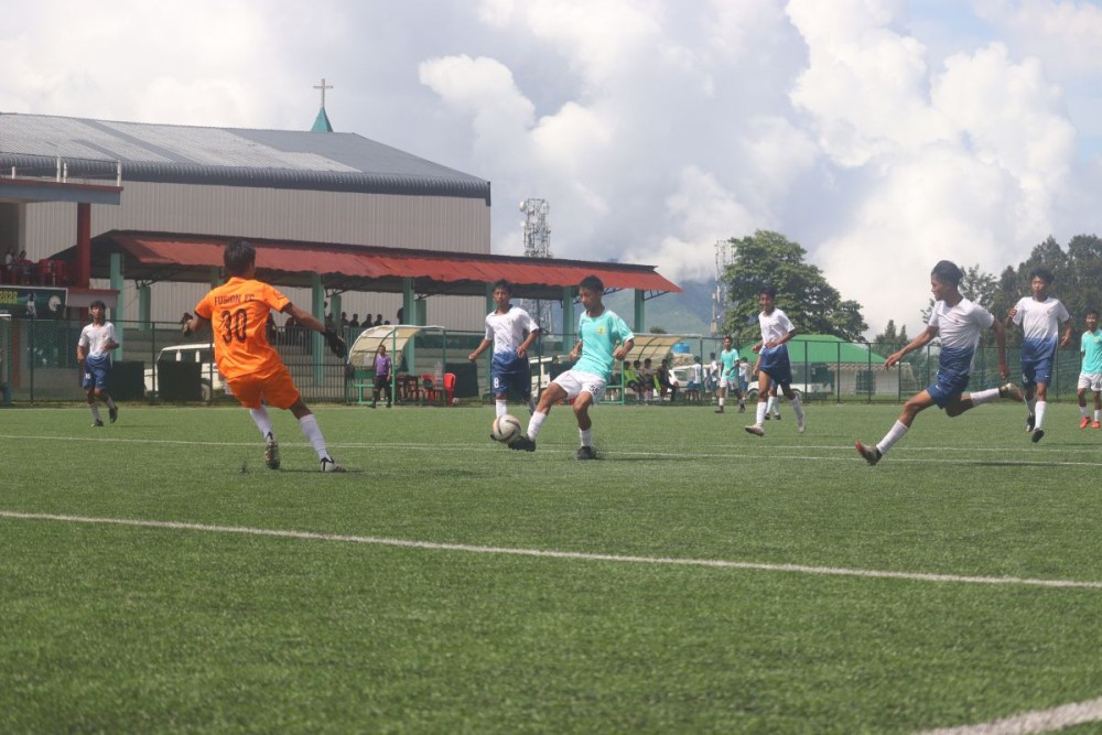 A match in between Sonshang FC (Cyan) and Fusion FC (White). (Morung Photo)
