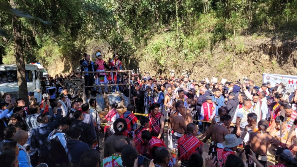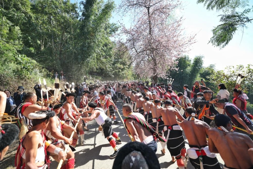 A traditional stone-pulling ceremony, involving nearly a thousand participants from four Naga communities, was held at Tuophema Village on December 5.