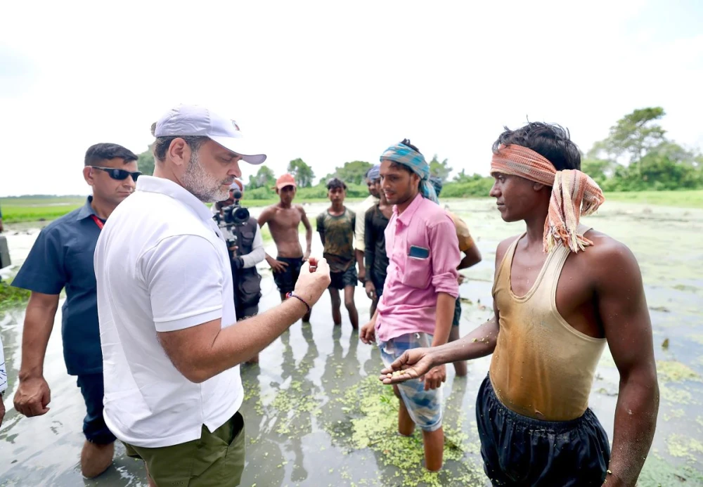 While passing through Kursela, LoP Rahul Gandhi made an unscheduled stop at Makhana fields near Simaria.