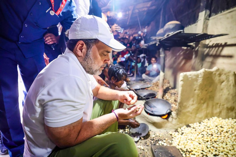 Katihar: Lok Sabha Leader of Opposition and Congress MP Rahul Gandhi roasts makhana to eat during an interaction with farmers in Katihar district, Bihar, on Saturday, August 23, 2025. (Photo: IANS)